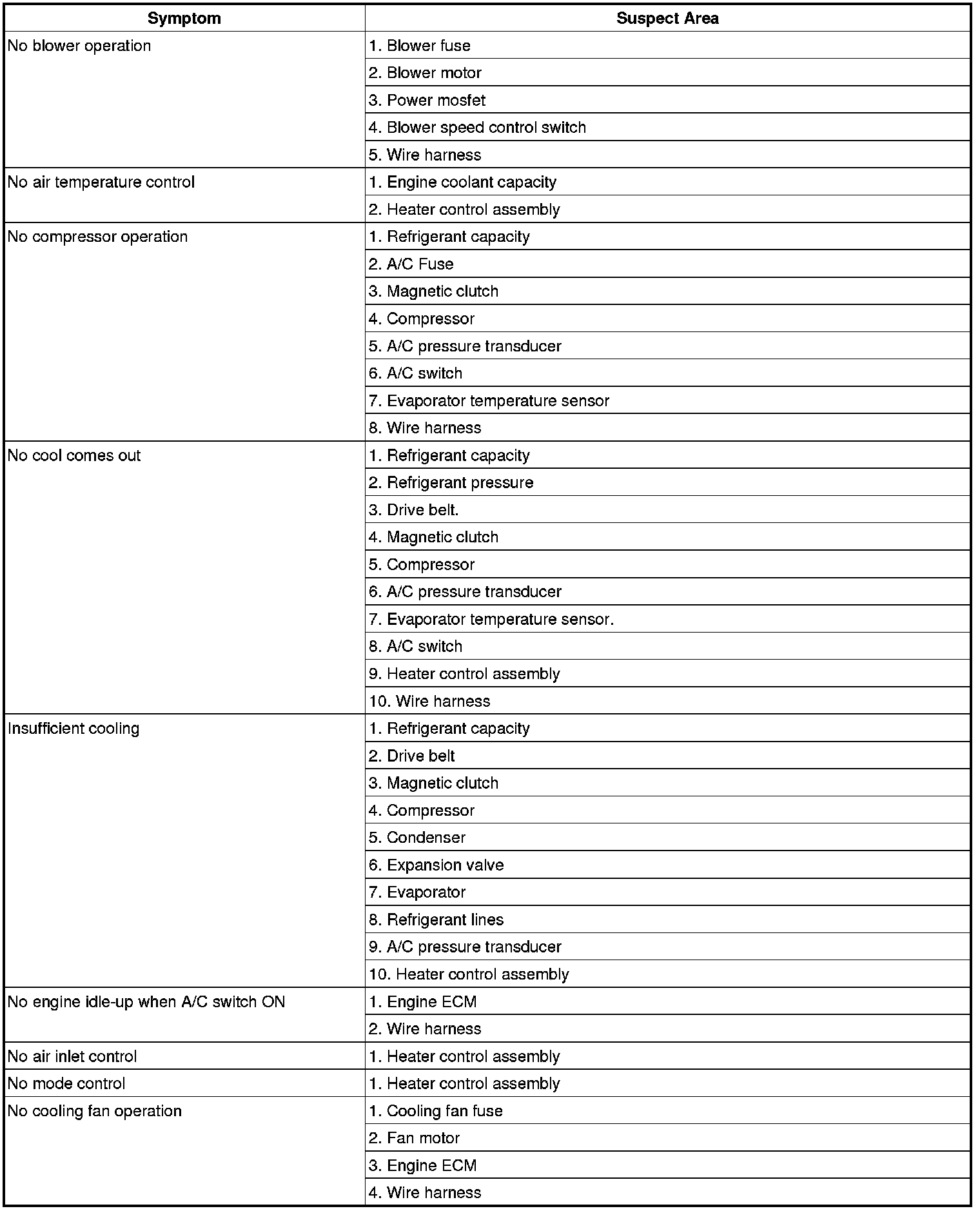 Problem Symptoms Table