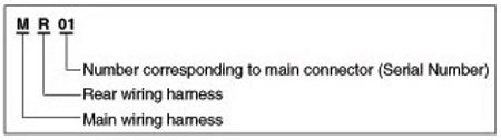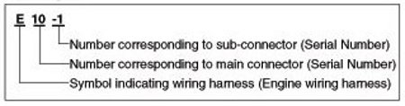 A Connector identification symbol consists of a wiring harness location classification symbol corresponding to a wiring harness location and number corresponding to the connector.