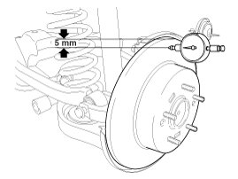 1. Place a dial gauge about 5mm (0.2 in.) from the outer circumference of the brake disc, and measure the runout of the disc.