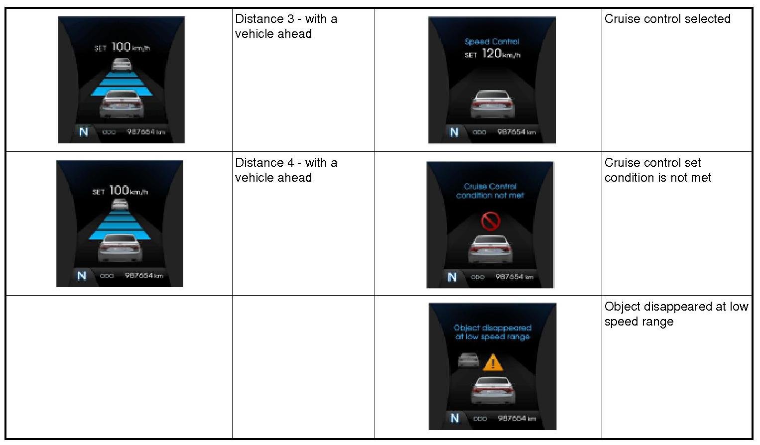 (3) If the vehicle ahead (vehicle speed: less than 30km/h) disappears to the next lane during following distance control, the warning chime will sound and a message will appear. Adjust your vehicle speed for vehicles or objects that can suddenly appear in front of you.
