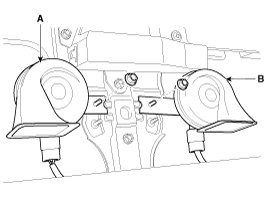 2. Remove the mounting nut and disconnect the horn connector, then remove the high pitch horn (A) and low pitch horn (B).