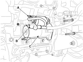 5. Remove the 2 bolts holding the starter, then remove the starter (C).