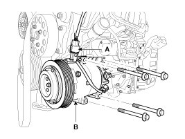 6. Disconnect the compressor clutch connector(A), and then remove mounting bolts and the compressor (B).