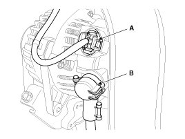 3. Disconnect the alternator connector (A) and the cable (B) from alternator "B" terminal.