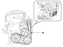 2. Remove the drive belt (B) after loosening the belt tension by turning the bolt adjusting (A) counterclockwise.