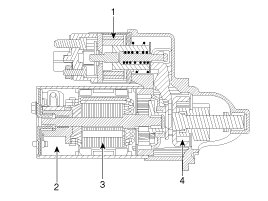 The contacts close and the starter motor cranks. In order to prevent damage caused by excessive rotation of the starter armature when the engine starts, the clutch pinion gear overruns.