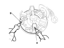 Make sure there is no continuity between the (+) brush holder (A) and (-) plate (B). If there is continuity, replace the brush holder assembly.