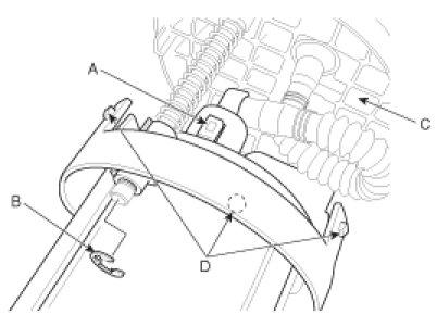 5. Remove the cushion pipe fixing clip (B) after pressing the head assembly (C).