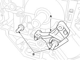 1. Install the tensioner adapter (A) and the timing chain guide bolts (B).