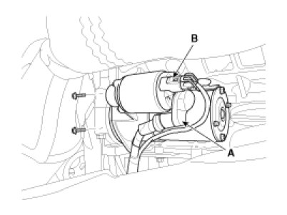 2. Disconnect the starter cable (A) from the B terminal on the solenoid, and the connector (B) from the S terminal.