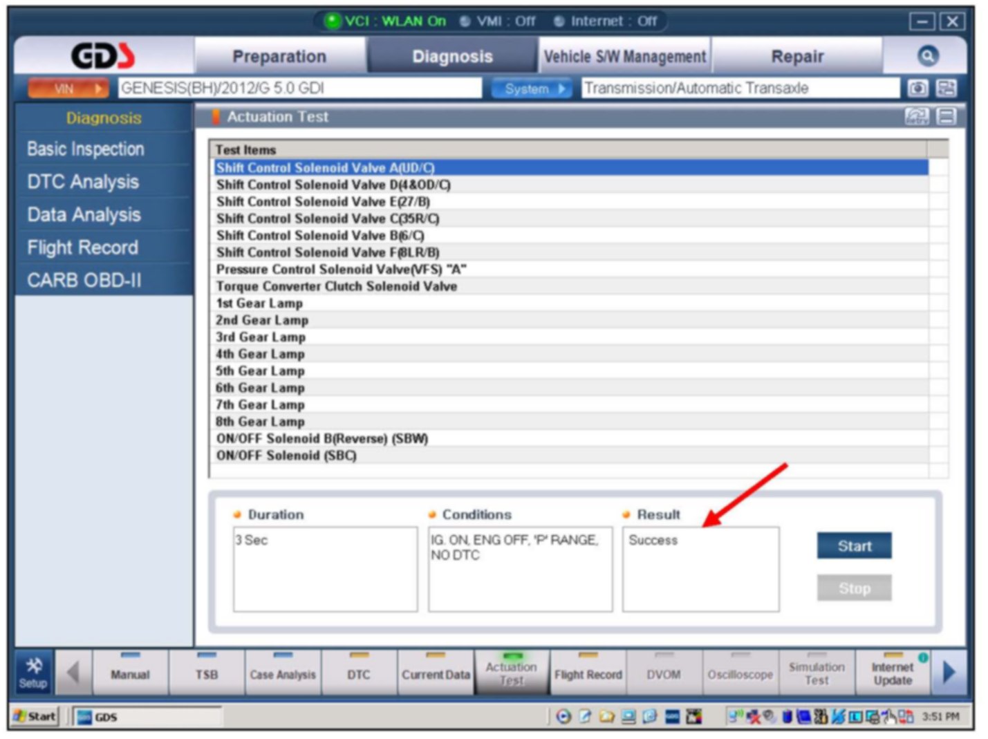 ^ Press the "Start" button and look for a "Success" indication and listen for a solenoid operation noise. If necessary, use Chassis Ears or a stethoscope.