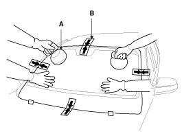 9. Use suction cups (A) to hold the windshield over the opening, align it with the alignment marks (B) made in step 15, and set it down on the adhesive. Lightly push on the windshield until its edges are fully seated on the adhesive all the way around. Do not open or close the doors until the adhesive is dry.