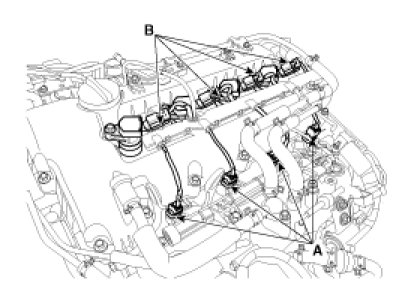 2. Disconnect the injector connectors (A), ignition coil connectors (B) and ignition coils.