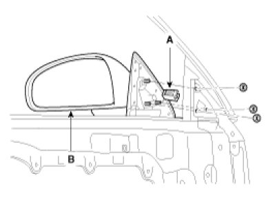 2. After disconnecting the connector (A), remove the outside rear view mirror (B).