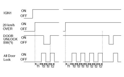 (2) On condition of IGN1 SW ON, output all door lock within T1 when keeping more than setting speed in (1). But, do not output LOCK if all DOORS are LOCKED or FAIL at first.