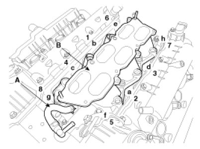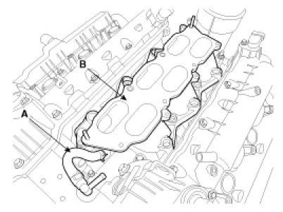 Install the intake the manifold (B) with a new gasket, and connect the water vent hose (A).