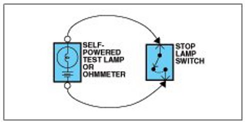 An ohmmeter can be used in place of a self-powered test lamp.
