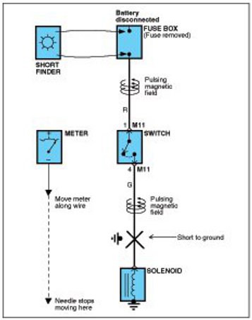 A short finder is available to locate a short to ground. The short finder creates a pulsing magnetic field in the shorted circuit and shows you the location of the short through body trim or sheet metal.