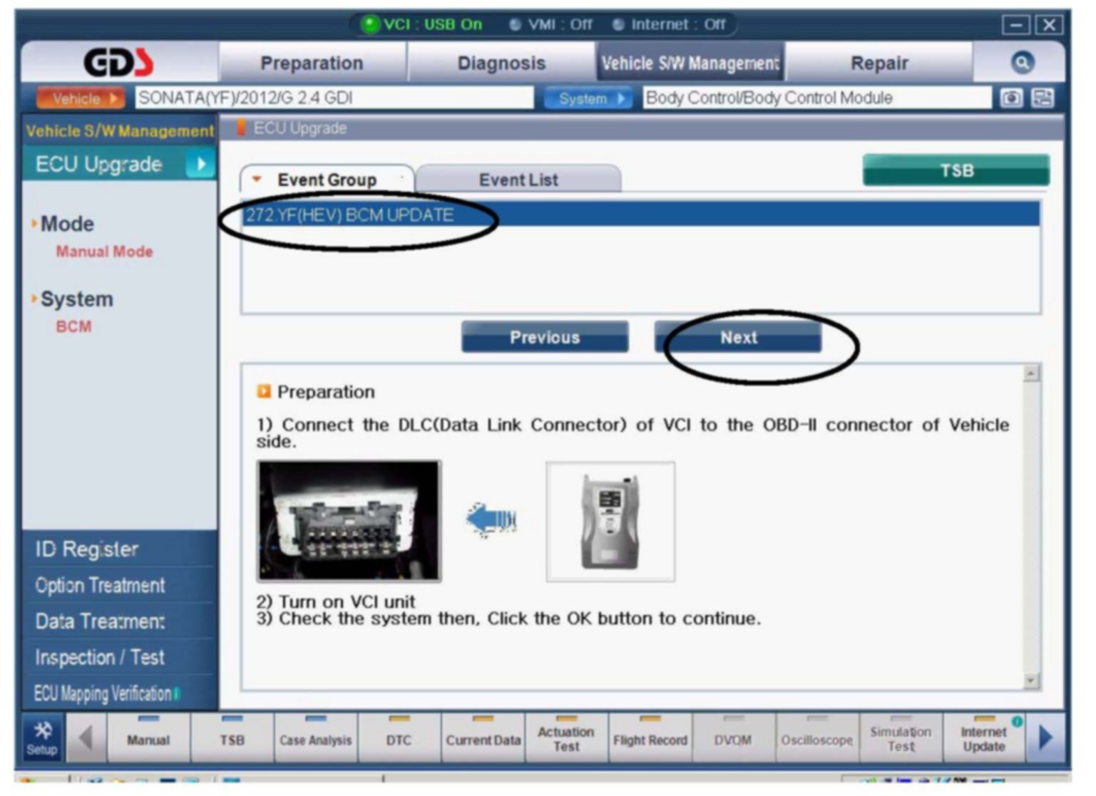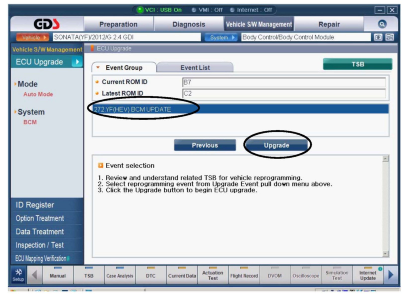 5.6 Select the reprogramming event "272 YF BCM UPDATE" and then select Upgrade.