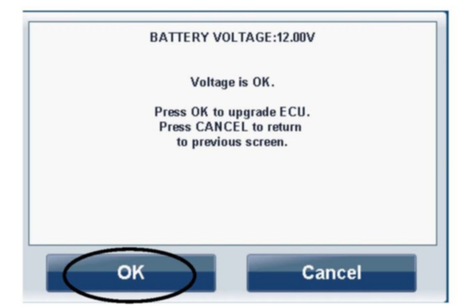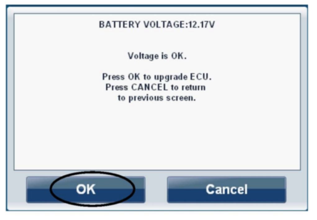 5.7 If the screen indicates "Voltage is OK" (voltage 12 volts or greater), select OK. If not, select CANCEL and charge the vehicle battery by running the engine for 10 minutes.