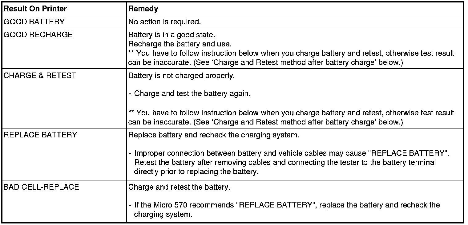 Shut off engine end disconnect the tester clamps from the battery. Refer to the following table and take the appropriate action as recommended by the Micro 570.