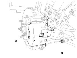 1. Loosen the guide rod bolt (B) and pivot the caliper (A) up out of the way.