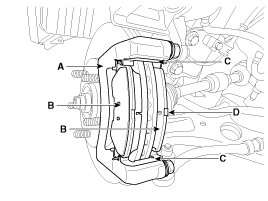 2. Replace pad shim (D), pad retainers (C) and brake pads (B) in the caliper carrier (A).
