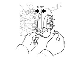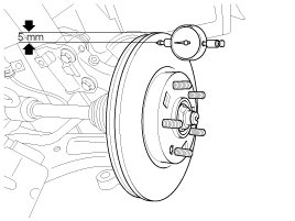 1. Place a dial gauge about 5mm (0.2 in.) from the outer circumference of the brake disc, and measure the runout of the disc.