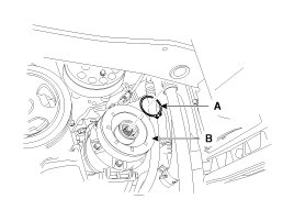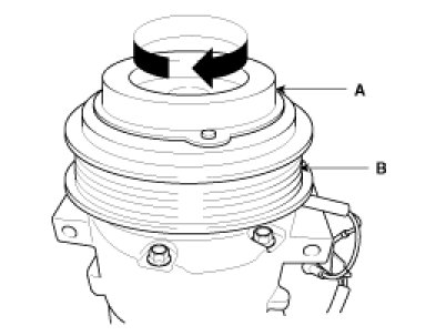 2. Check the pulley (B) bearing play and drag by rotating the pulley by hand. Replace the clutch set with a new one if it is noisy or has excessive play/drag.
