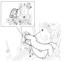 5. Disconnect the inlet (A) and outlet (B) heater hoses from the heater unit and then remove the cover (C).