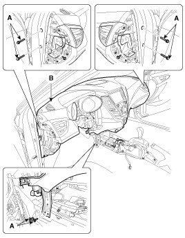18. Loosen the cowl cross member mounting bolts (A) and then remove the crash pad and heater & blower unit assembly (B).