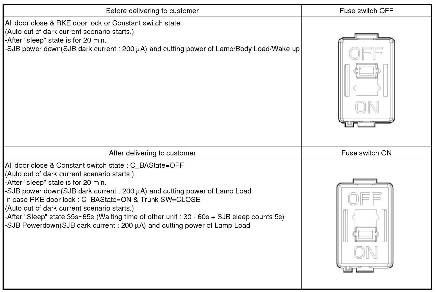 A. "Sleep" condition : IG OFF, constant input switch, CAN network doesn't activate.