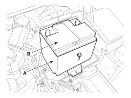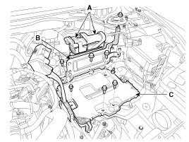5. Remove the ECM (B) and the battery tray (C) after disconnecting the ECM connector (A).