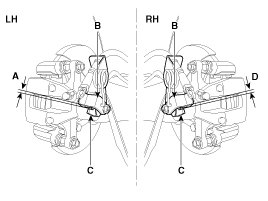 4. Tension the parking brake cable by tightening the adjusting nut, until the operating levers on both calipers lift from the stop, up to a distance of (A) and (D) between operating lever (B) and stopper (C).