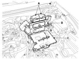5. Disconnect the ECM connectors (A) and then remove the ECM (B) and the battery tray (C).