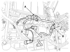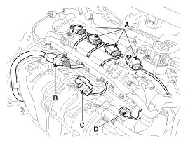 (3) The ignition coil connectors (A), the injector extension connector (B), the VIS (Variable intake system) connector (C) and the PCSV (Purge control solenoid valve) connector (D)