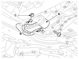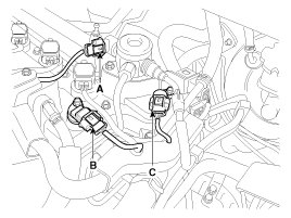 (4) The FPCV (Fuel pressure control valve) connector (A), the intake CMPS (Camshaft position sensor) connector (B), the exhaust CMPS (Camshaft position sensor) connector (C).