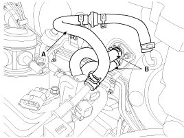 8. Disconnect the radiator upper hose (A) and lower hose (B).