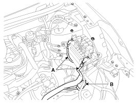 14. Disconnect the (+) cable (A) from the fuse/relay box and the front connector (B).