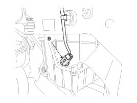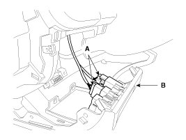 4. Disconnect the connector(A) and then remove the crash pad lower corner(B).