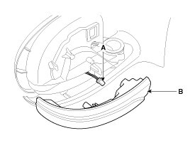 3. Disconnect the mirror connector (A). Remove the door mirror turn signal lamp (B) after loosening screw.