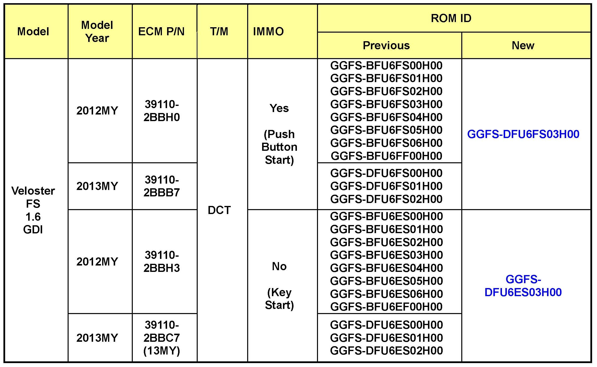 Verify the ECM ROM ID before updating the vehicle's software. Refer to the table.