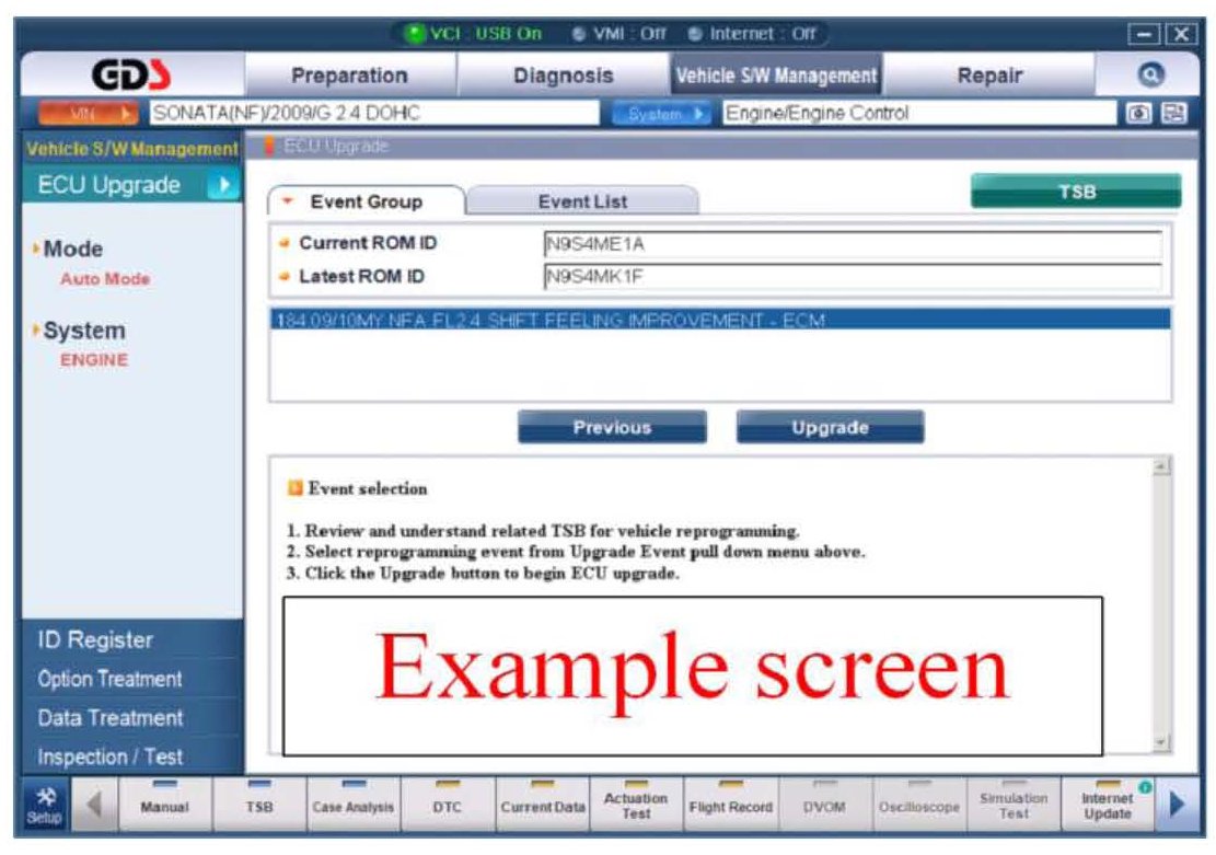 1. From the GDS home page, select ECU Upgrade. If necessary, select the VIN.