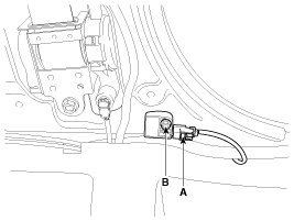 1. Install the new side impact sensor with the bolt (B) then connect the side impact sensor connector (A).