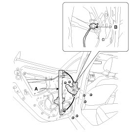 6. After loosening the mounting screws, then remove the rear door window motor (A).