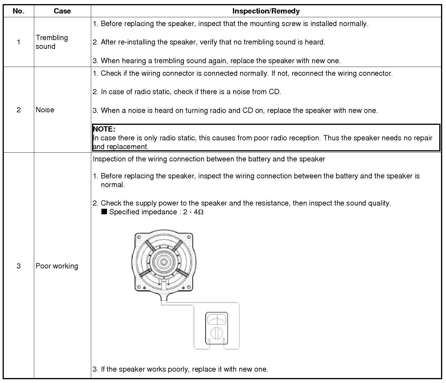 Inspect the sound from speaker after verifying that the speaker mounting screws are removed and the wiring connector is connected to remove any possible vibration transmitted from body trims and surrounding parts.