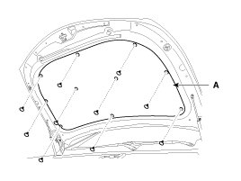 1. Using a clip remover, detach the clips, and remove the hood insulator pad (A).