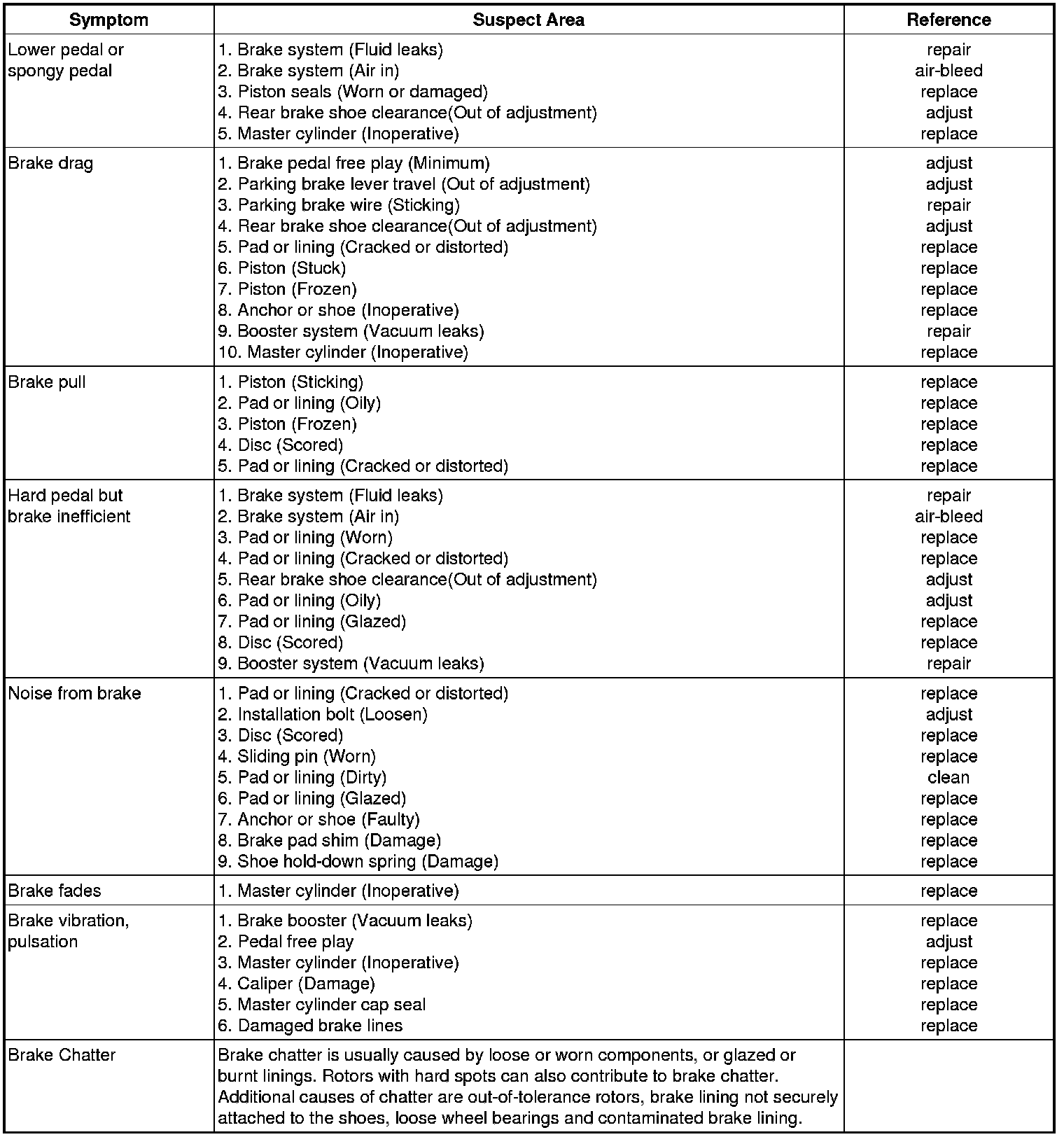 Problem Symptoms Table