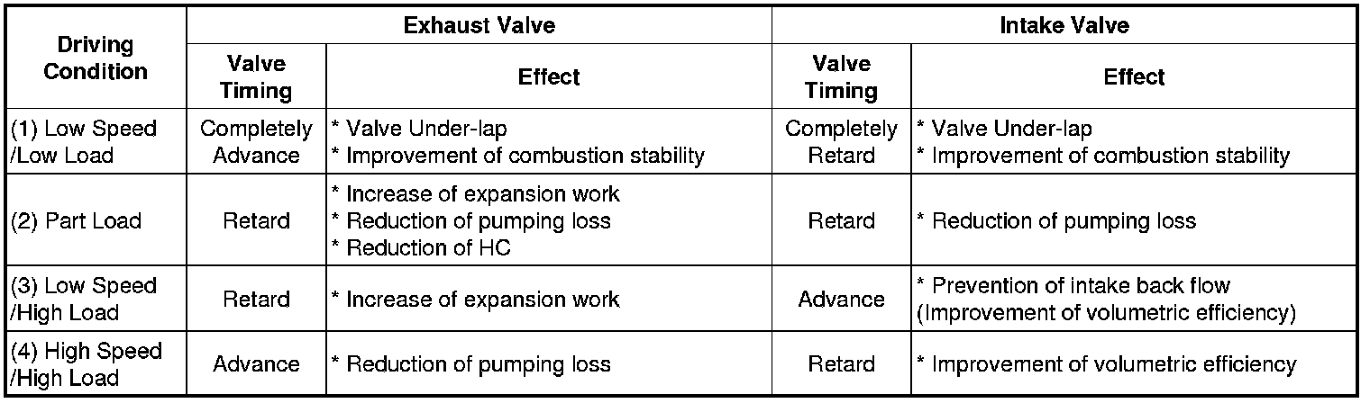 Continuous Variable Valve Timing (CVVT) system advances or retards the valve timing of the intake and exhaust valve in accordance with the ECM control signal which is calculated by the engine speed and load.