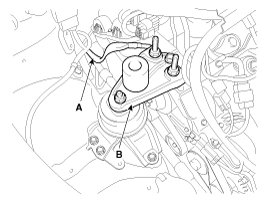 2. Disconnect the ground cable (A), and then remove the engine mounting support bracket (B).